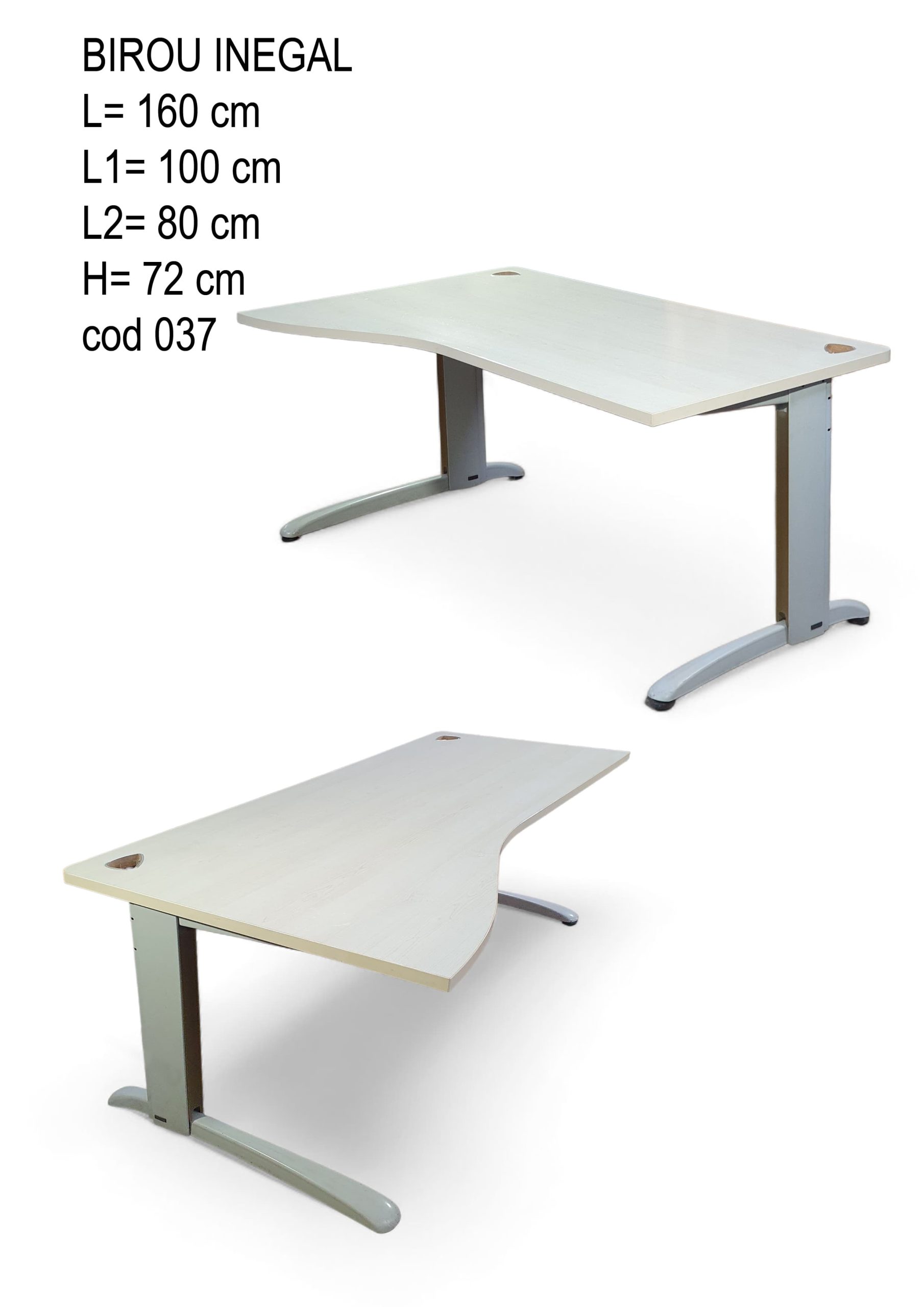 Birou inegal, finisaj bej, cu picioare metalice asimetrice. Design modern și original, ideal pentru birouri, home office sau spații creative, oferind funcționalitate și stil contemporan.
