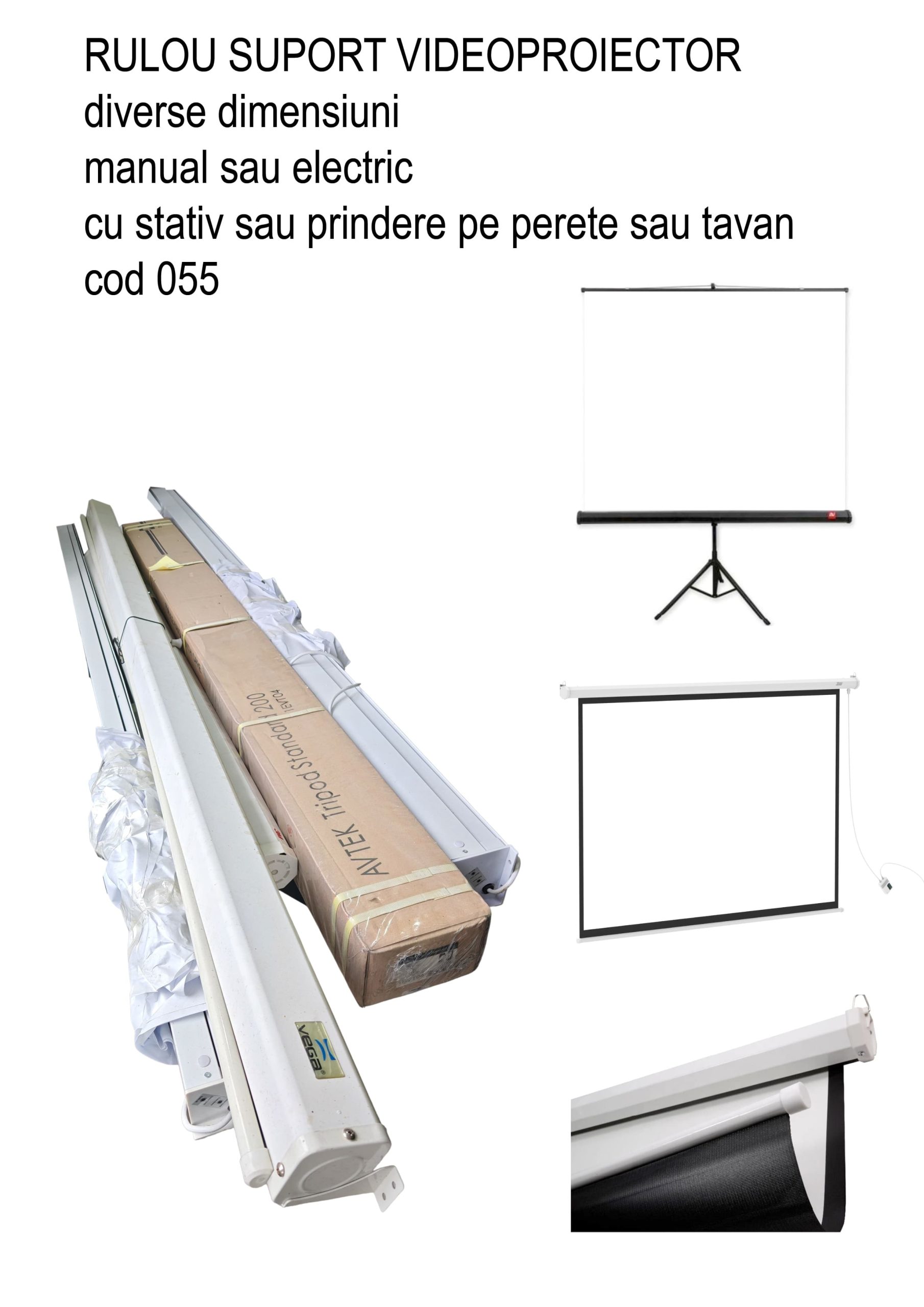 Rulouri pentru proiecție video, disponibile în variante manuale sau electrice, cu stativ mobil ori sistem de prindere pe perete sau tavan. Soluții versatile pentru prezentări, săli de conferință, școli sau home cinema. Acestea au diferite lungimi si diagonale, intre 200cm si 350cm.