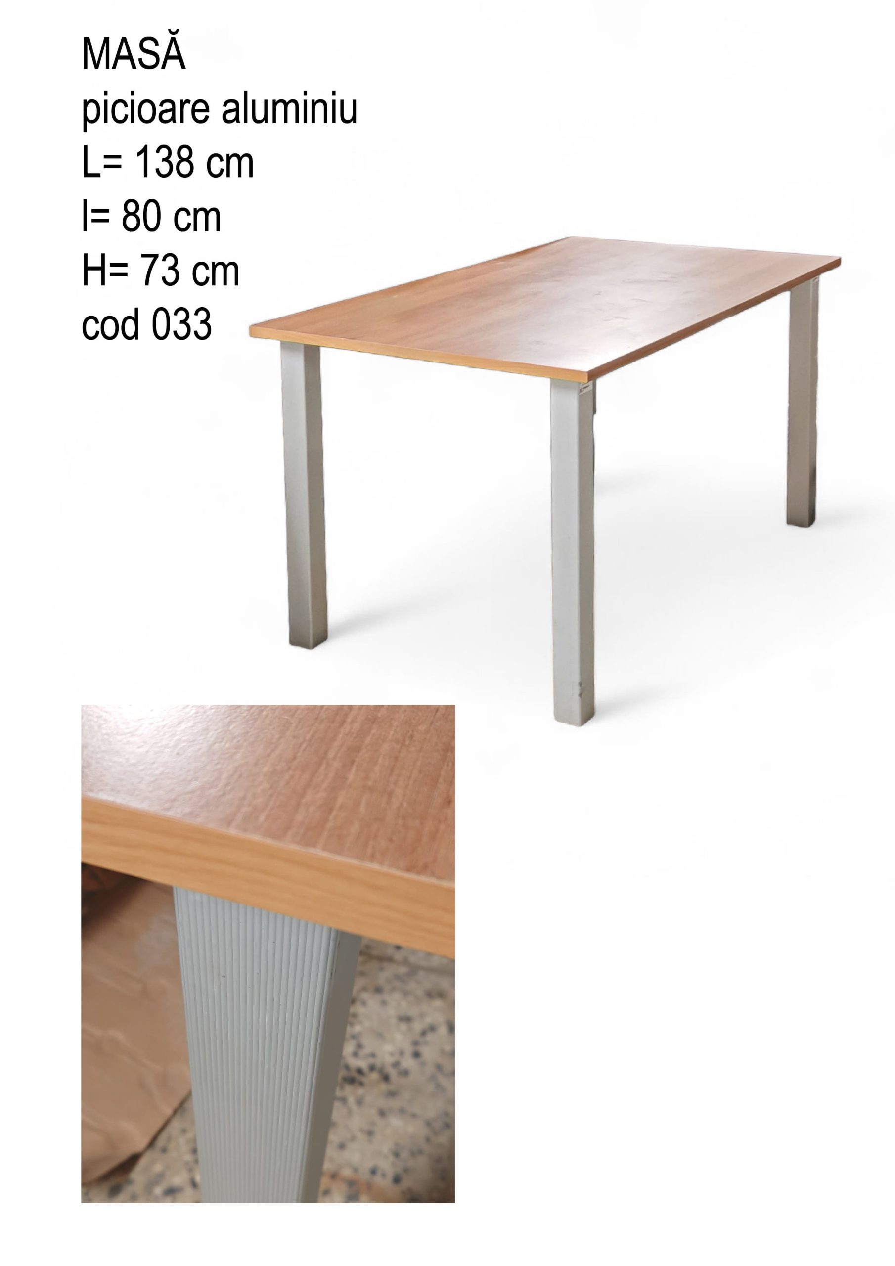 Picioarele din aluminiu asigură stabilitate, durabilitate și rezistență în timp, fiind totodată ușoare și ușor de întreținut. Blatul oferă suficient spațiu pentru servirea mesei zilnice, iar designul său simplu permite integrarea facilă cu diverse tipuri de scaune.