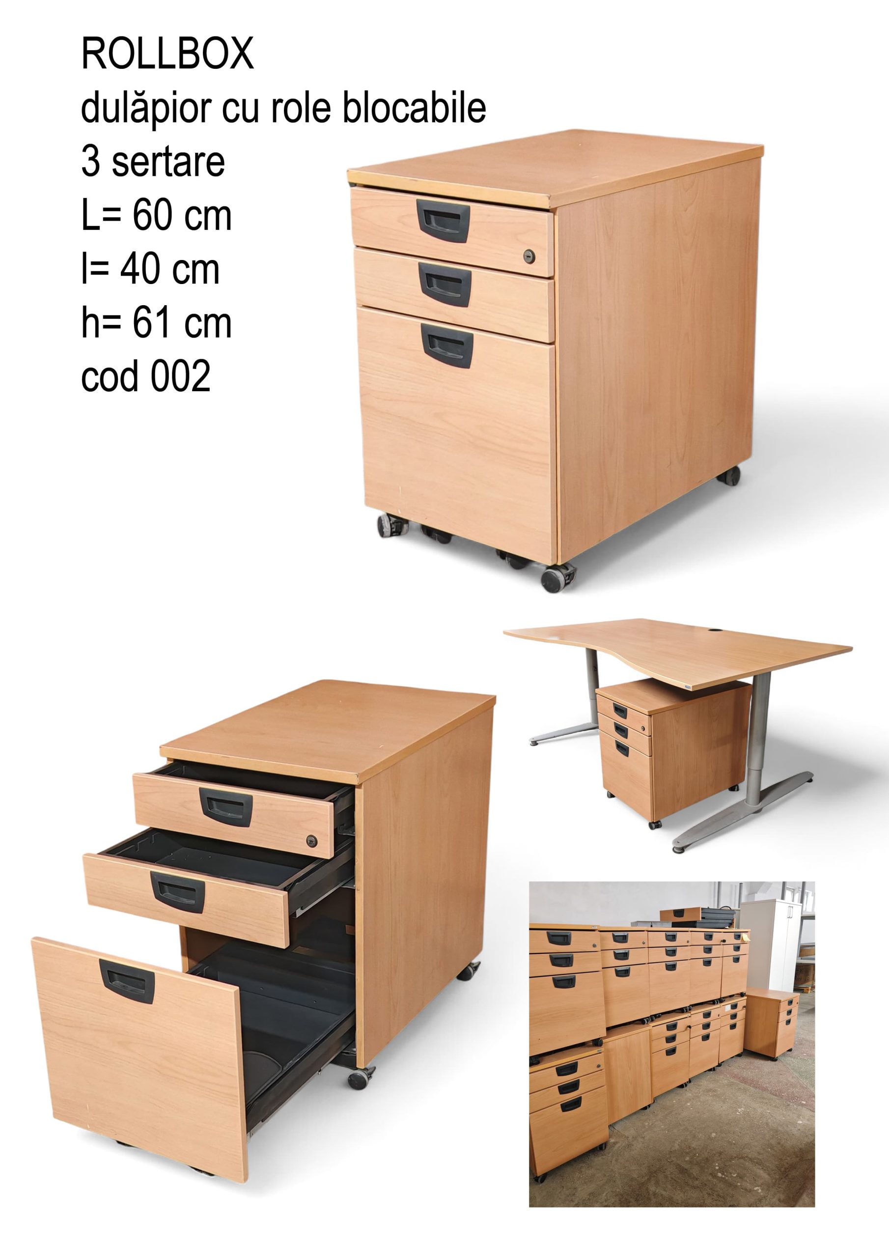 Rollbox cu trei sertare, culoare fag, pe role blocabile. Ideal pentru birou, atelier sau home office, combină mobilitate, durabilitate și organizare eficientă a documentelor și accesoriilor.