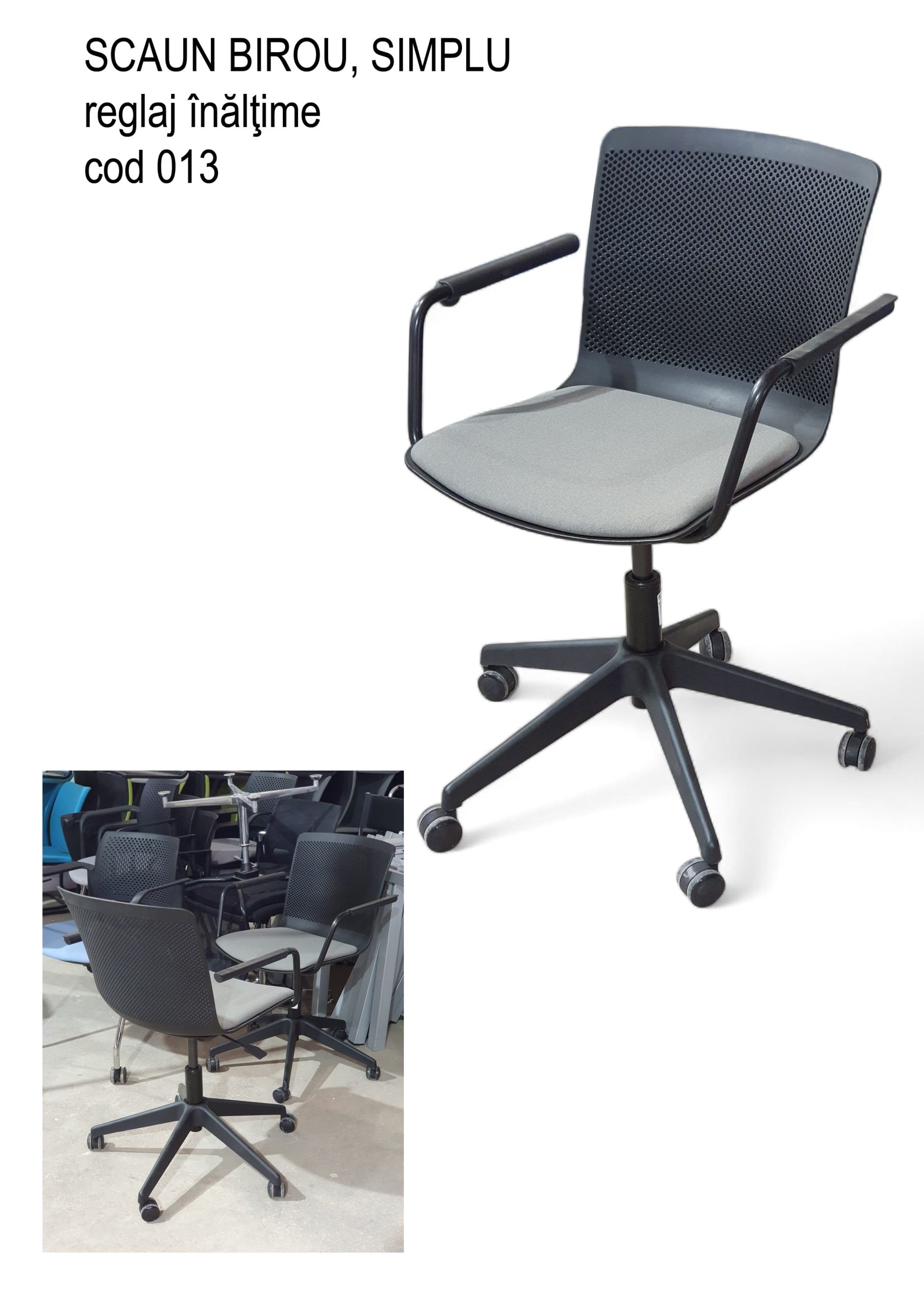 Scaunul negru din compozit, pe role, cu spătar aerisit și șezut textil, este proiectat pentru a oferi confort, mobilitate și susținere optimă persoanelor cu probleme de deplasare sau mobilitate redusă. Spătarul aerisit asigură ventilație eficientă și confort termic, în timp ce șezutul textil oferă o suprafață plăcută la ședere, reducând disconfortul pe perioade lungi de utilizare.